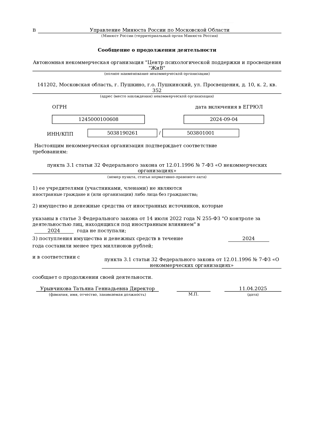Устав АНО «Центр психологической поддержки и просвещения «ЖиВ»